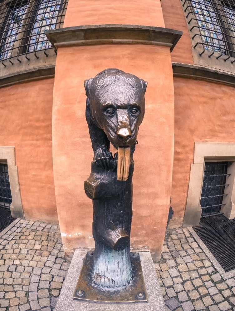 18. Przy Ratuszu mieszka miś. Ma około półtora metra wysokości, waży blisko trzysta kilogramów. Według niektórych źródeł do niedźwiadek malajski. Pewien artysta podarował go miastu, gdyż na wrocławskim Rynku nie było żadnej fontanny. Misiowi woda tryskała z nozdrzy, którą można było pić z kubków zawieszonych na konarze. Pogłaszcz misia 🙂