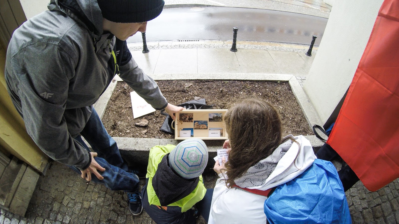Po warsztatach rodzinne drużyny ruszyły do gry miejskiej. Pogoda chciała nam pokrzyżować plany, bo okazała się iście brytyjska, jednak nasze zespoły nie bały się deszczu 🙂
